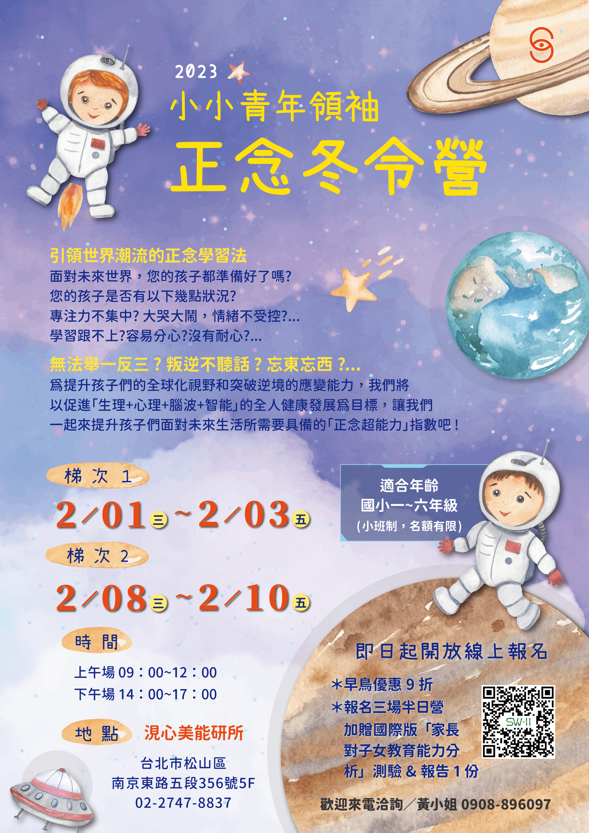 我們也將提供客製化且經國際認可的「心理健康風險控管評估分析」服務,幫助孩子跟家長們可以更加有效地認識自己的心理健康、學習成長等方面的需求外,並能掌握最有效且合適自己的教導與學習方式。期盼透過本次活動,將正念超能力融入生活中,讓孩子在往後的人生道路上能有更開闊的全新視野,皆能成為未來國家的棟樑之才,並邁向全人身心健康、圓滿致富的幸福生活!