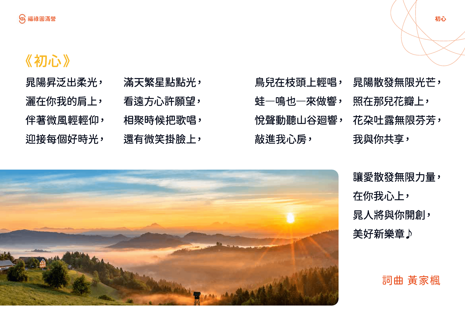 這句熟悉的祝福言猶在耳,去年的福祿圓滿營,我們在日月潭的山明水秀間與自己的初心相遇,《初心》細膩悠揚的樂音猶如母親溫柔的低語,滋潤每個人的心,與生俱來的愛的能量自心中汩汩流出。你是否還記得我們一起吟唱初心時感動的淚光?