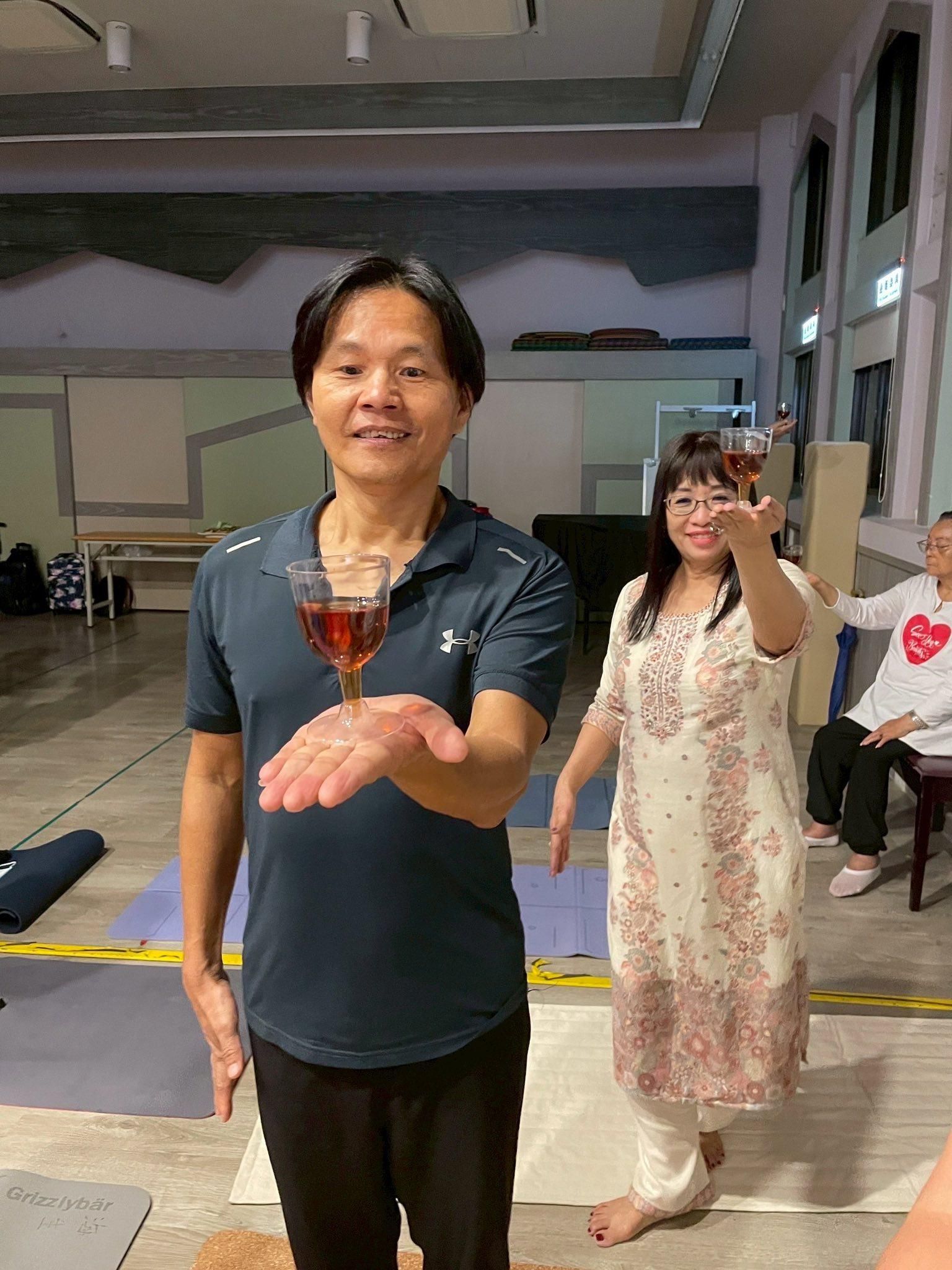 另一個小挑戰也令人印象深刻——掌托桂茶,全身搖擺卻不能讓茶灑出。一開始,注意力都放在手中的茶杯,但漸漸地,當意識完全融入身體的律動,杯子反而輕盈得彷彿不存在。這提醒我:在生活與學習中,唯有專注,才能穩穩前進,達成目標。
