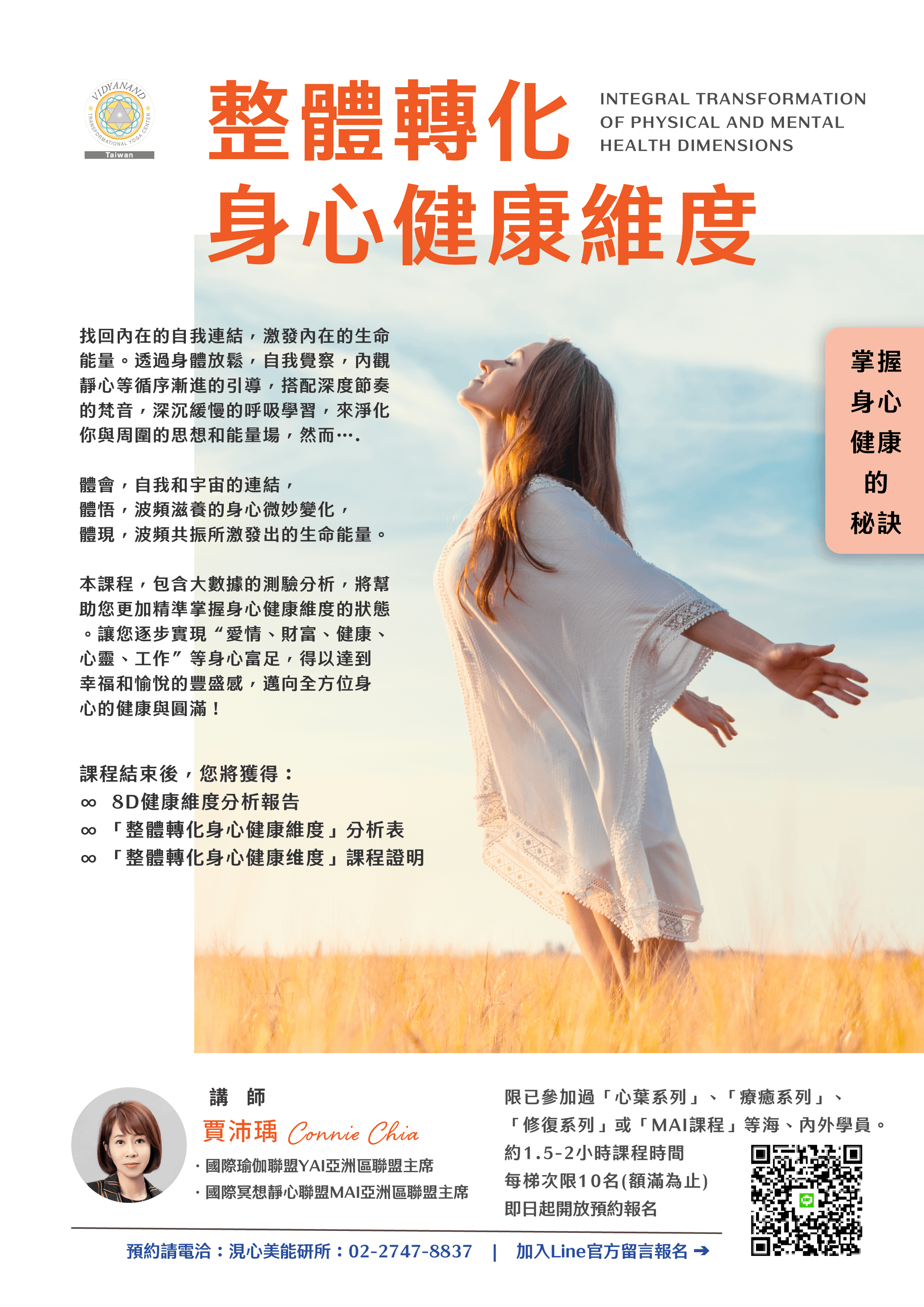 你了解自己的身心健康狀況嗎?透過8D健康維度測驗分析,以及講師的深入講解,協助學員找回自我與宇宙連結,透過波頻共振激發出生命能量。讓您逐步實現“愛情、財富、健康、心靈、工作”等身心富足,得以達到幸福和愉悅的豐盛感,邁向全方位身心的健康與圓滿 ! - 人數限制