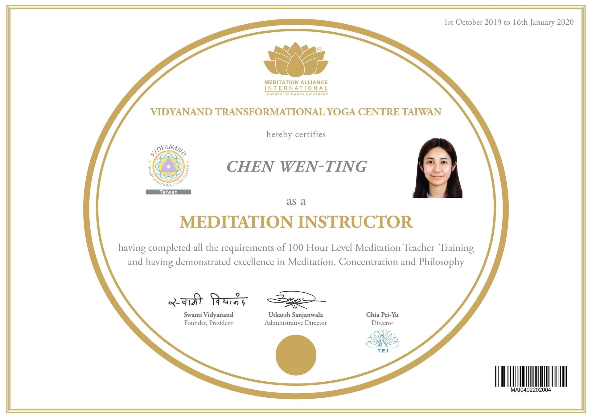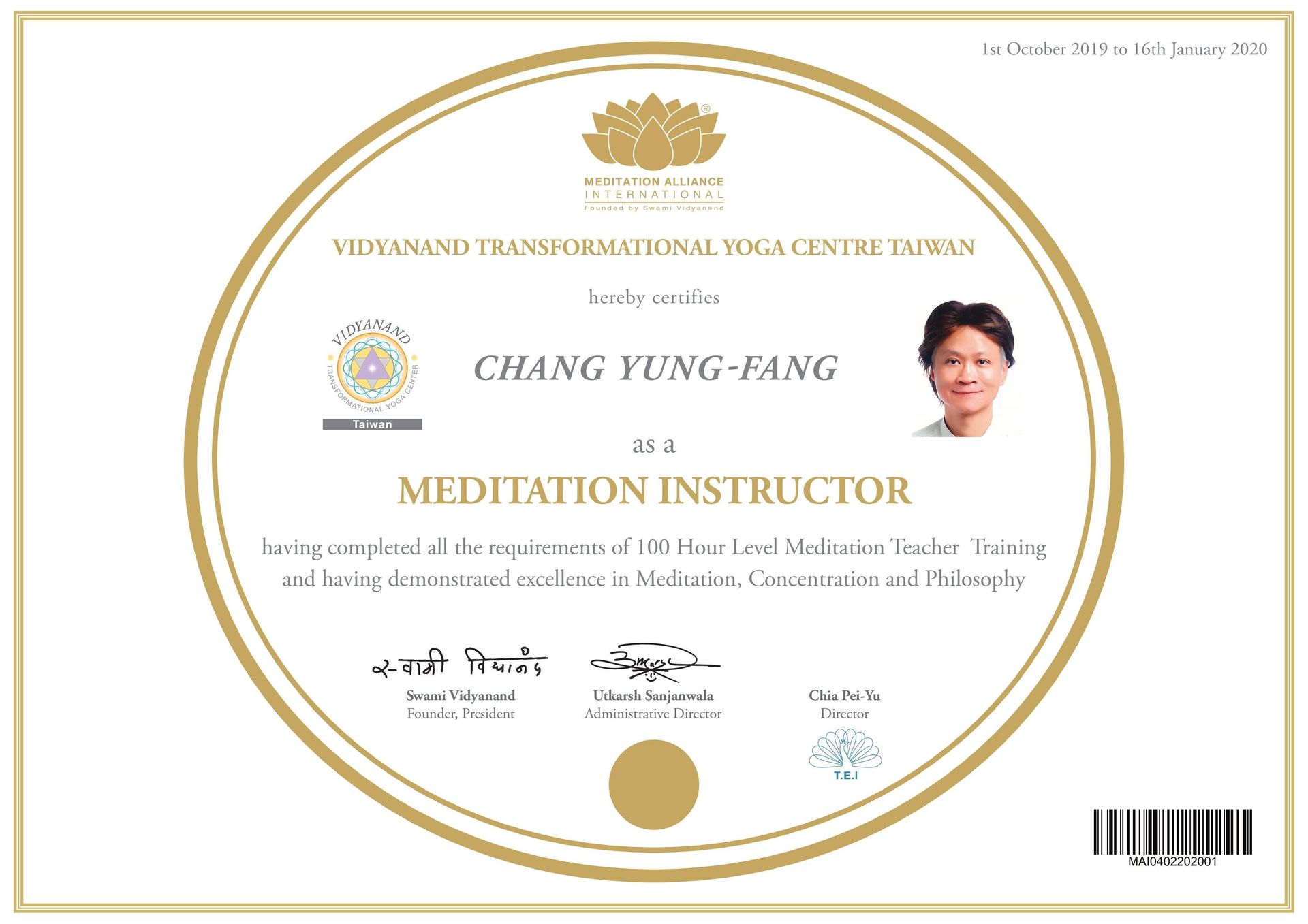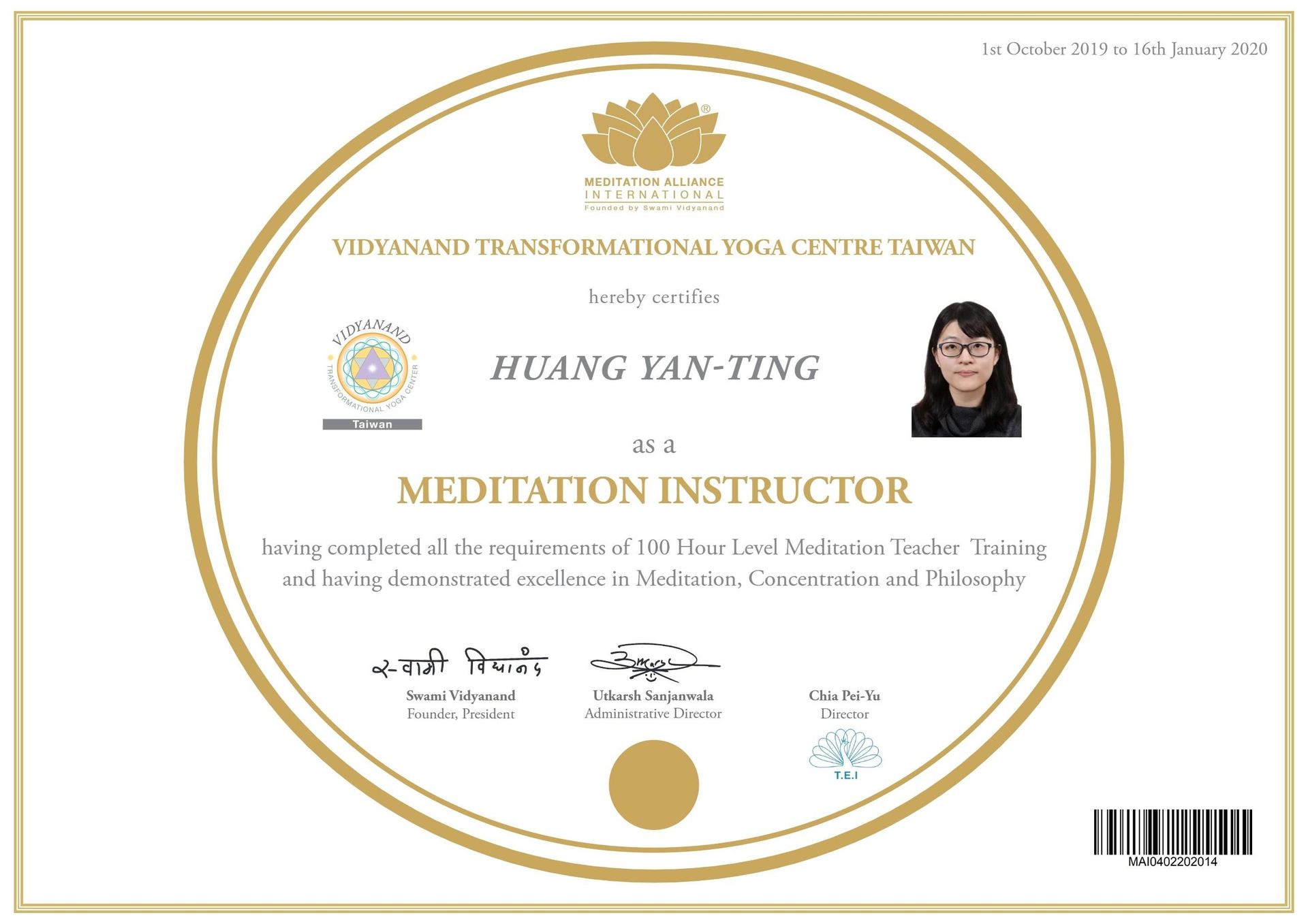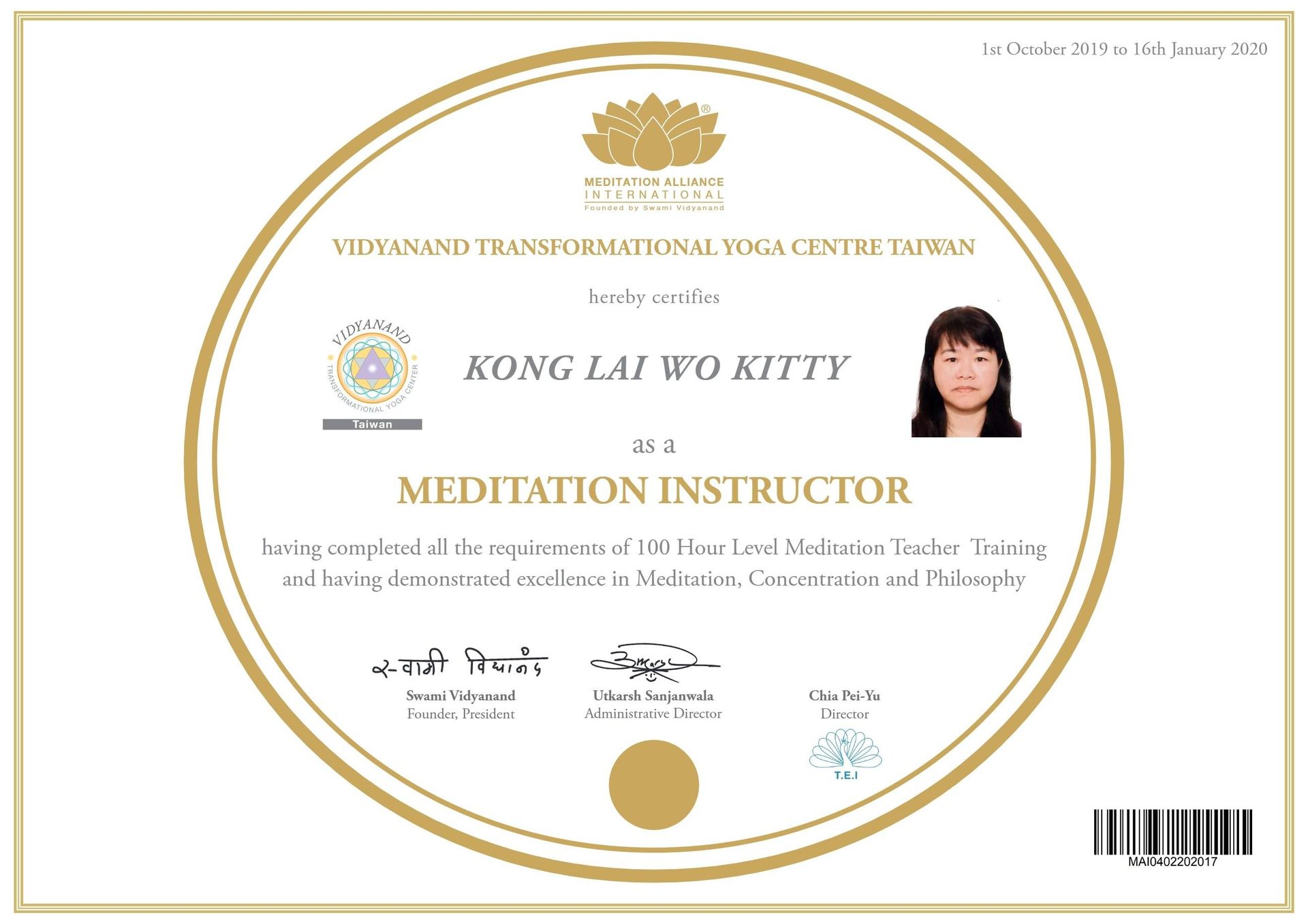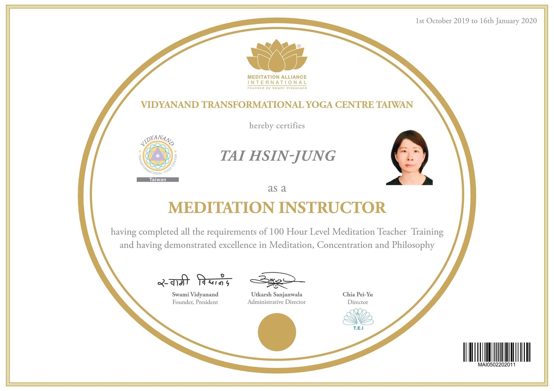 《2020 結業證書》MAI 100 小時國際冥想靜心指導員課程