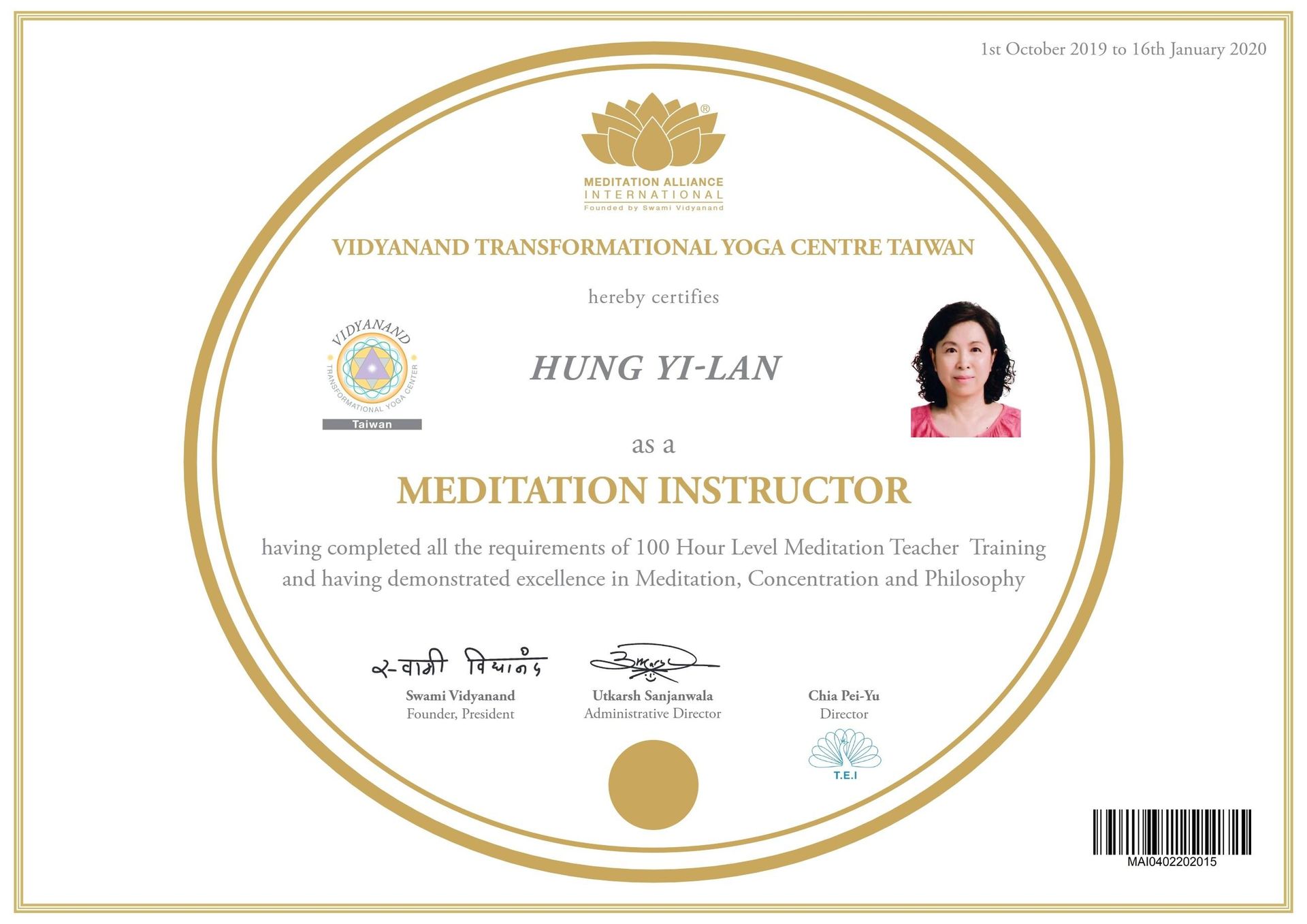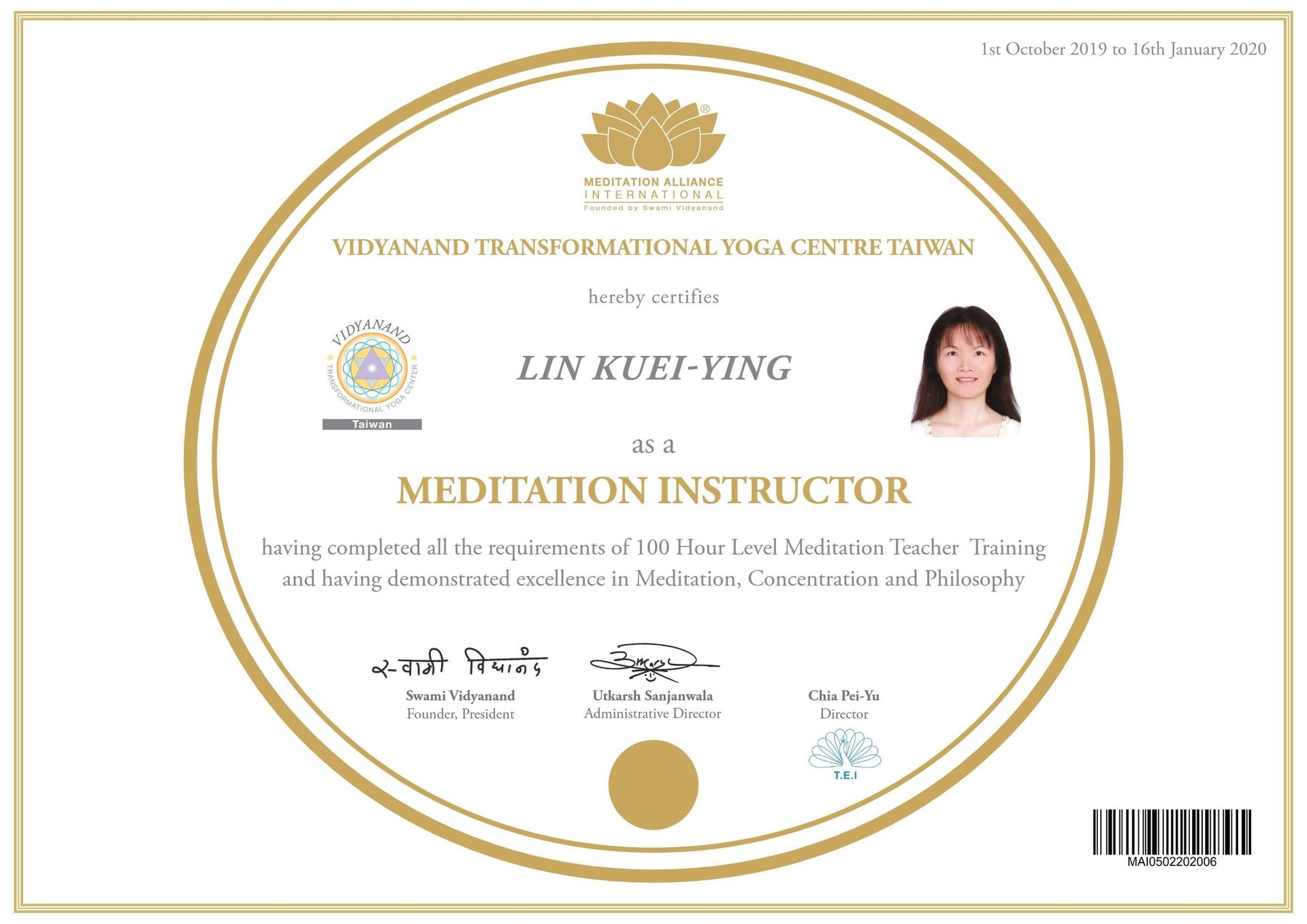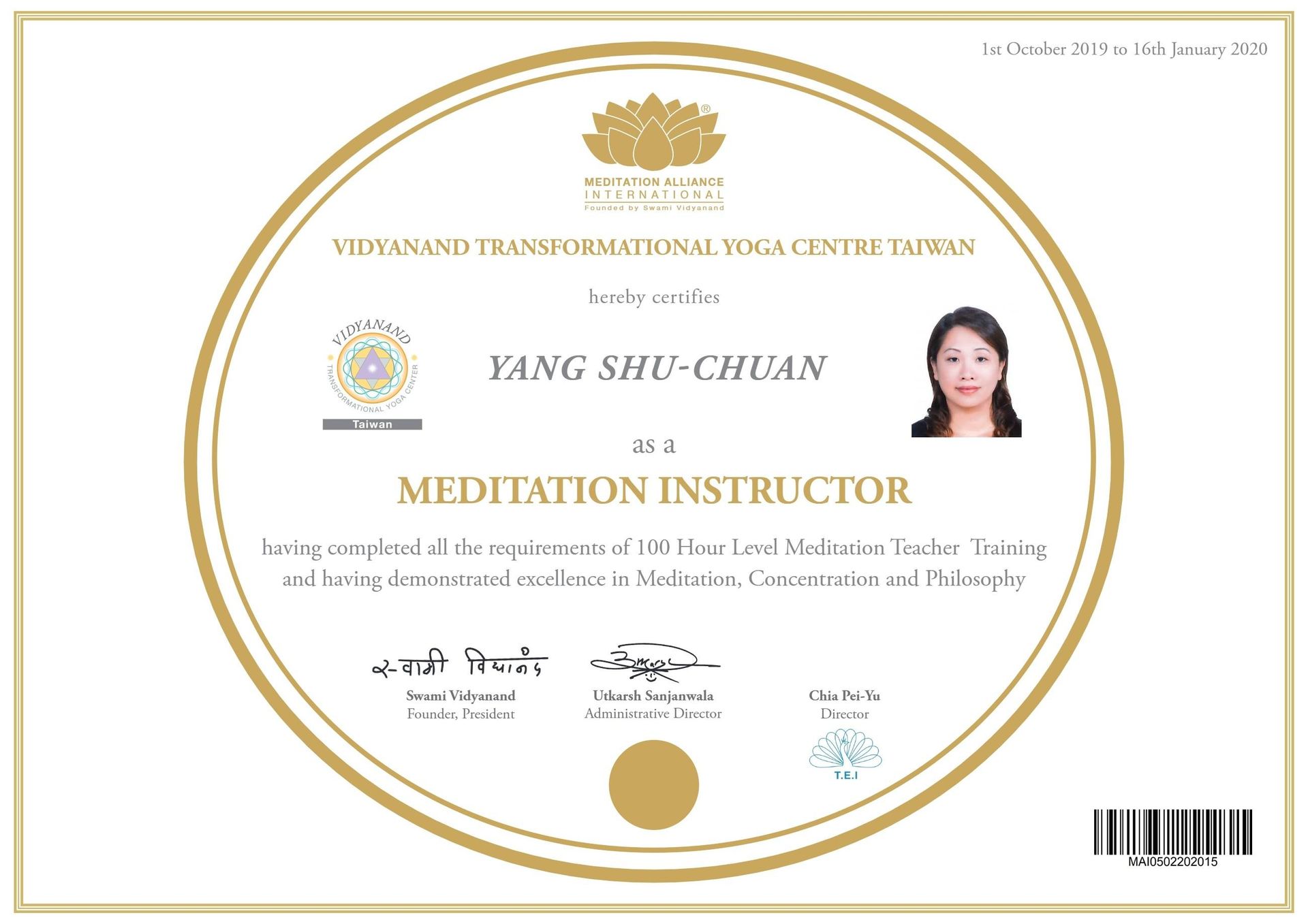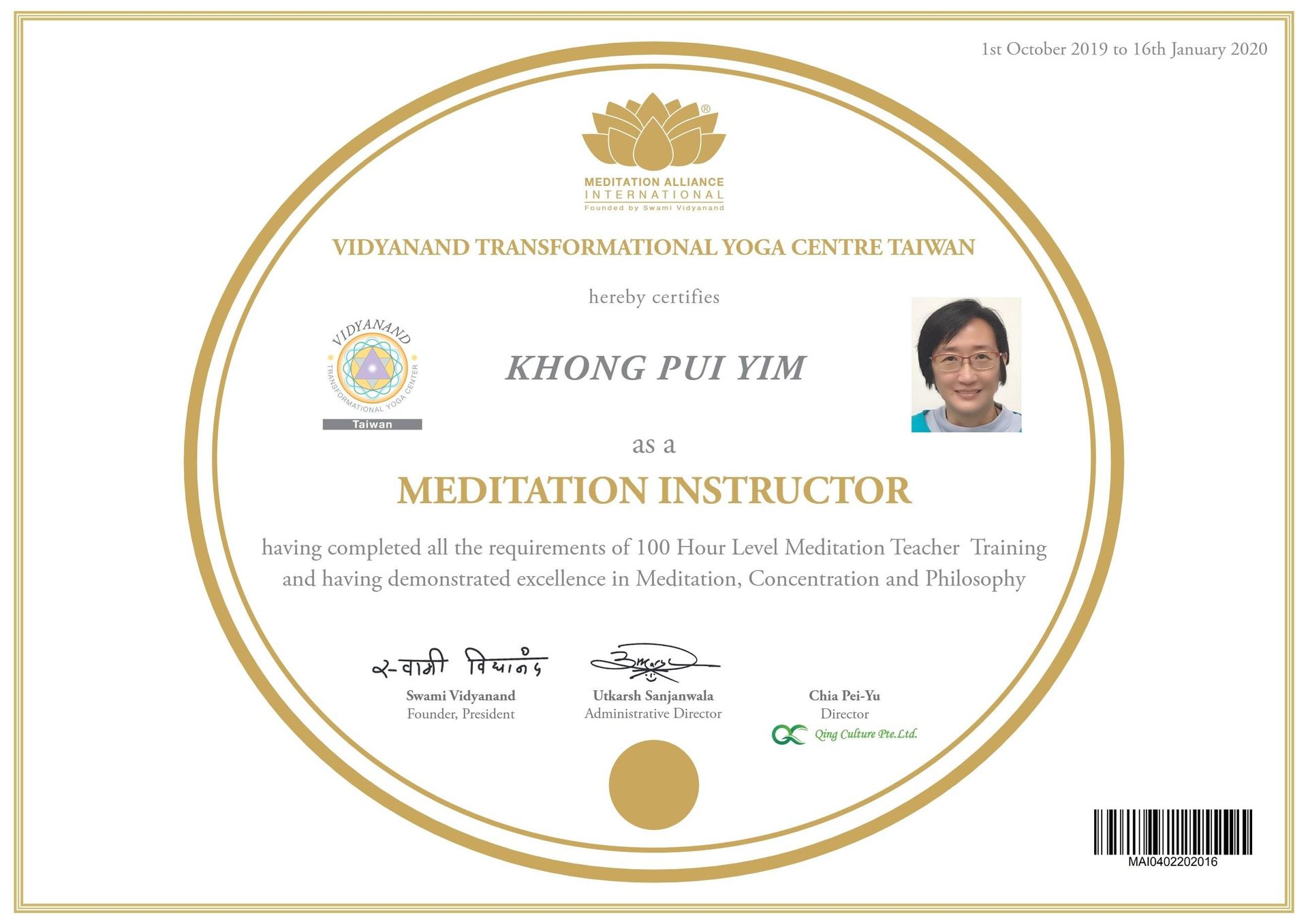 《2020 結業證書》MAI 100 小時國際冥想靜心指導員課程