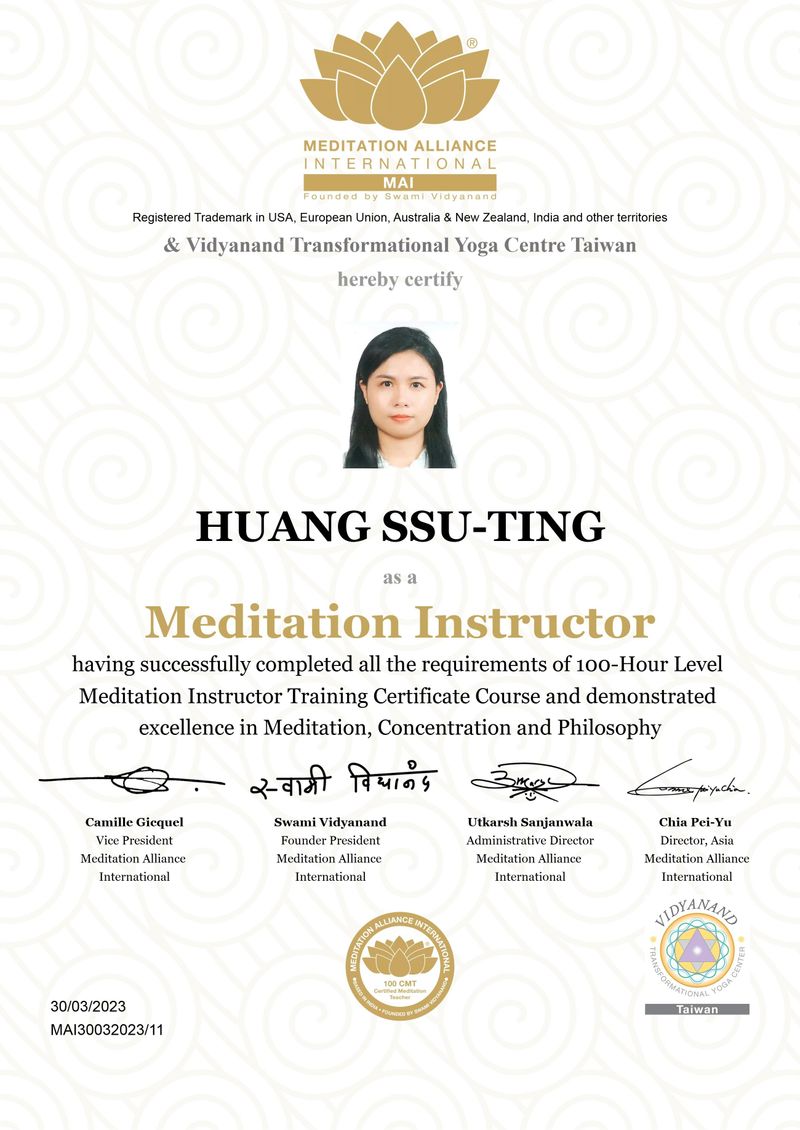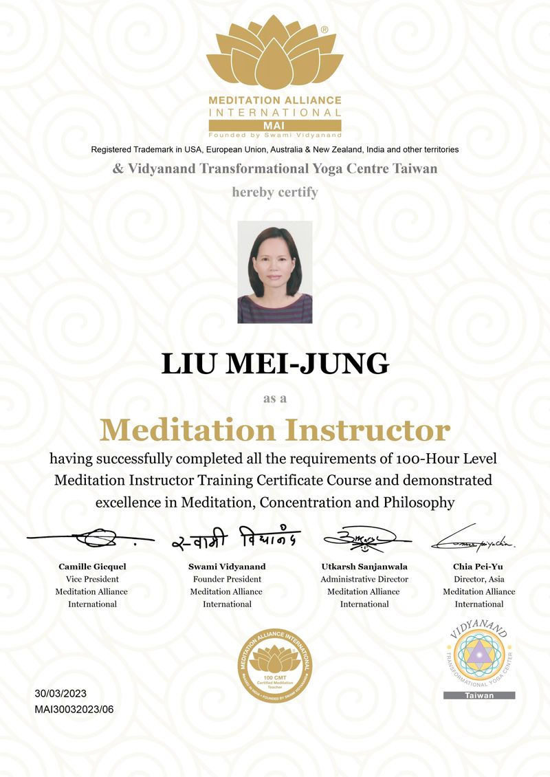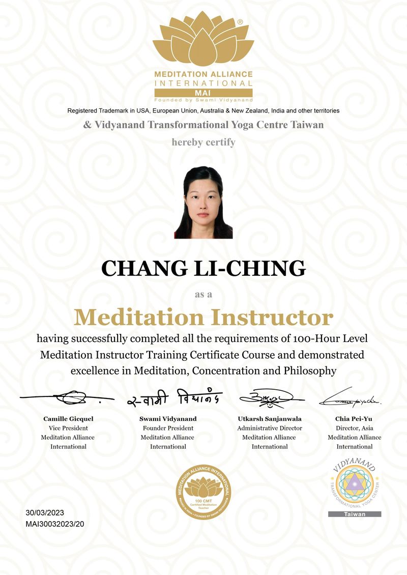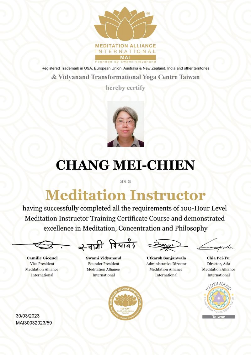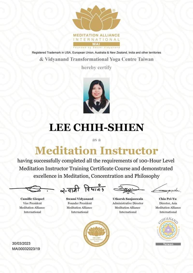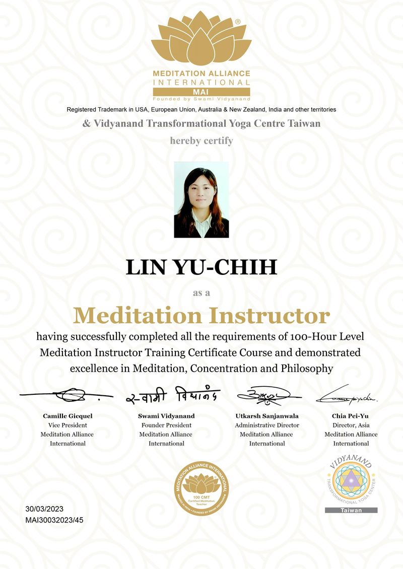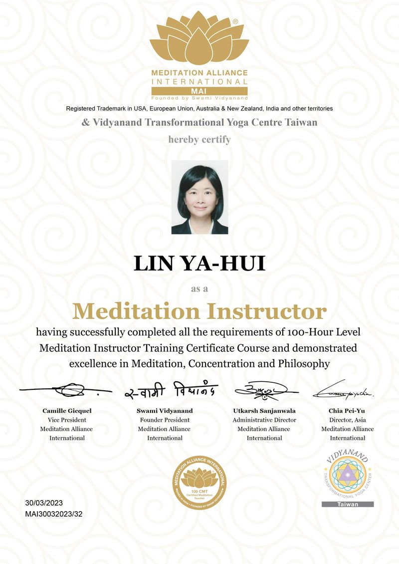 《2023結業證書》MAI 100 小時國際冥想靜心指導員課程