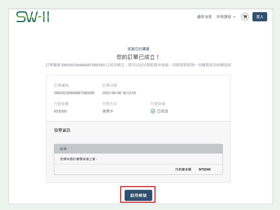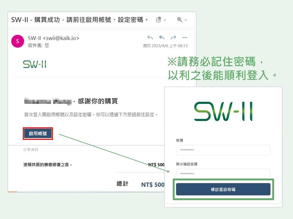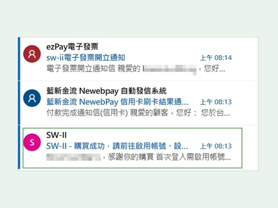 - 點入信件:SW-II - 購買成功,請前往啟用帳號、設定密碼。找尋與點選「啟用帳號」設定密碼。