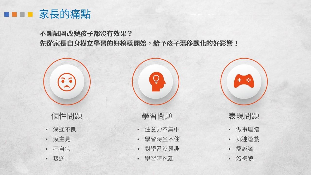 “父母的自我管理”:了解自己的優勢和劣勢,清楚自己對於子女的正面影響和需要改進的地方。家長如何能夠很好的控制自己的壓力,避免影響孩子。