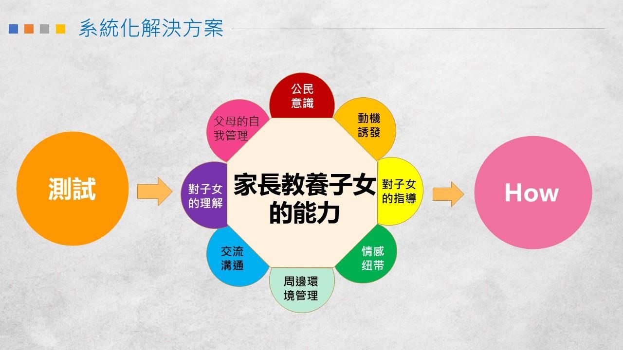 “家長對子女教育能力” 由父母自己評價自己的能力水平,並以結果為依據,幫助他們選擇對自己而言最需要、最適合的父母學習方案。